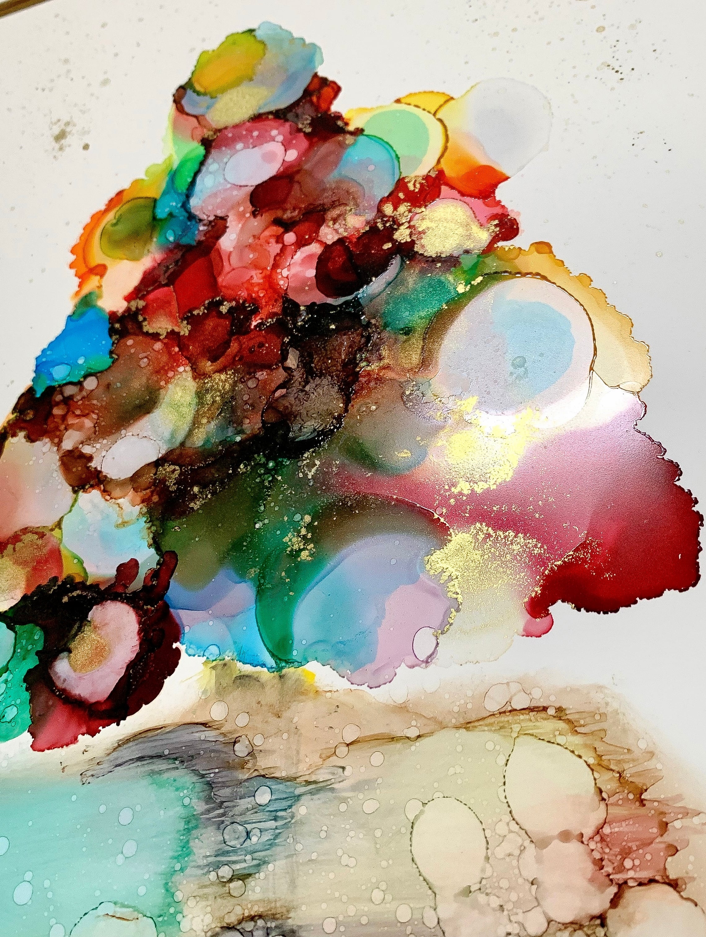 アルコールインクの色が自然に広がり混ざり合い、自然に任せて創られていく彩り。